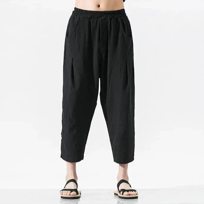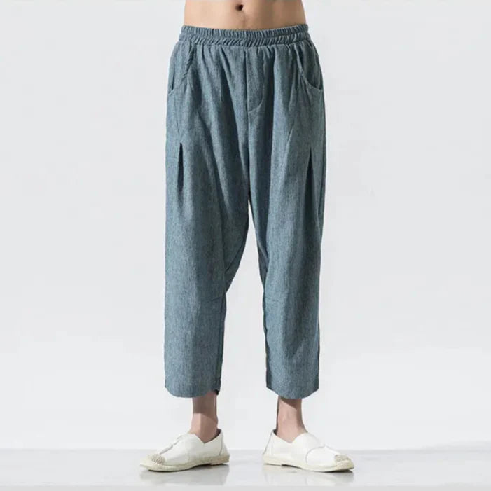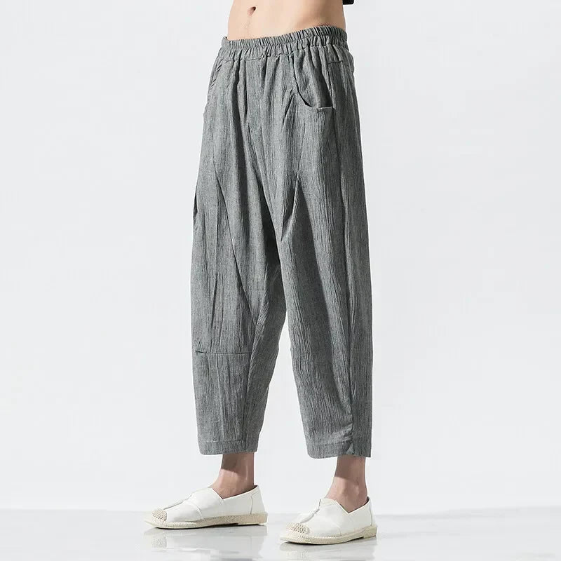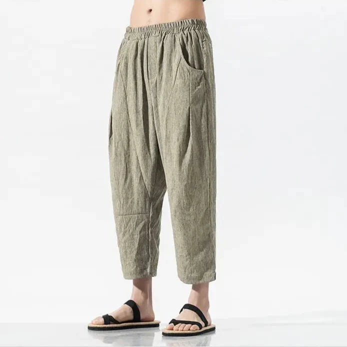 Feel the comfort of these soft, cotton-linen harem pants, featuring an elastic waist and a relaxed silhouette, perfect for slow mornings or elevated summer styling.